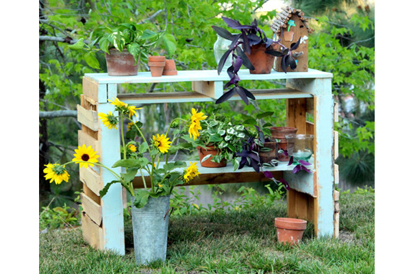 Một trong những điểm cộng của chất liệu pallet khi làm vật trang trí cho khu vườn của bạn chính là không cần phải sơn màu cho chúng vì tự thân màu gỗ pallet đã quá đỗi tinh tế rồi. Và bạn có thể giữ nguyên kích thước của gỗ pallet khi làm thành kệ trồng cây hoặc cắt chúng ra theo kích thước bạn mong muốn đều được. Đặt thêm những chậu cây trên bề mặt kệ gỗ pallet cũng là cách hay ho để trang trí thêm cho khu vườn của bạn.
