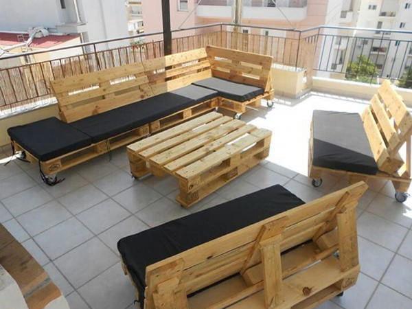 Liên kết các pallet với nhau, cùng những chiếc gối nệm bọc vải cotton để tạo ra chiếc ghế sofa giản đơn nhưng không kém phần thoải mái.