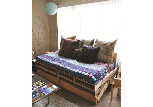 Liên kết các pallet với nhau, cùng những chiếc gối nệm bọc vải cotton để tạo ra chiếc ghế sofa giản đơn nhưng không kém phần thoải mái.